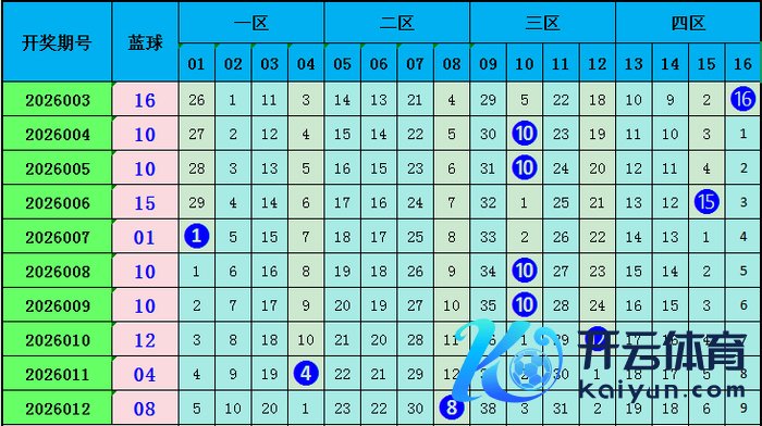 上期蓝球开出号码08,近十期开出蓝球在一区2个,二区1个,三区5个,四区2个,三区走势热,二区走势较冷,本期预测蓝球出当今四区,要点柔和号码13。