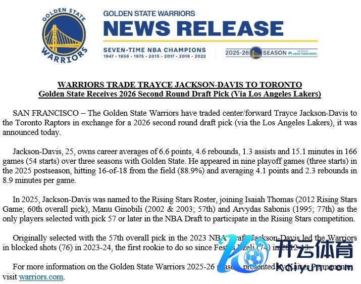 2月6日讯 据此前报说念,骁雄将中锋特雷斯·杰克逊-戴维斯交游官宣送去猛龙,换回顾自湖东说念主本年的次轮!
