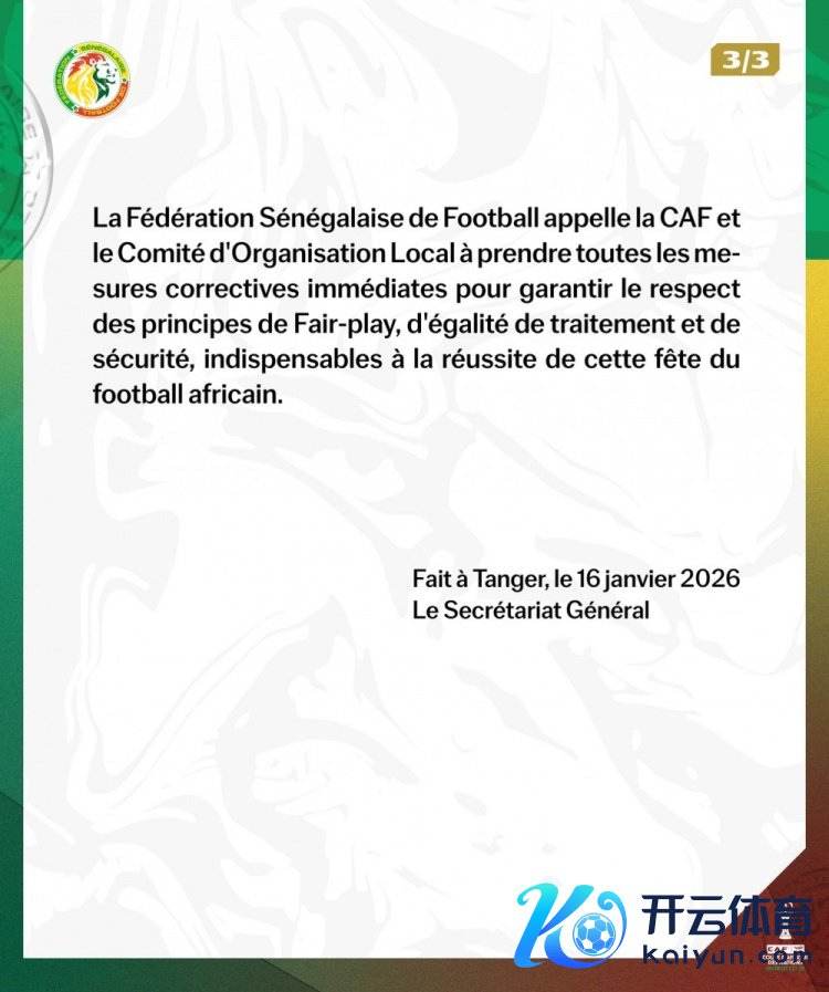 塞内加尔足协命令非洲足联及土产货组委会立即摄取一切必要编削纪律,确保刚正竞赛、对等对待和安全保险等基本原则获取尊重,以保险这次非洲足球嘉会圆满收效。