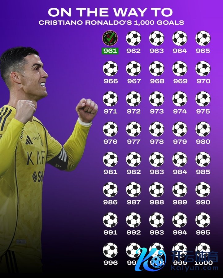 昨日的沙特联第19轮,利雅得告捷3-0打败十东谈主拉斯不灭,C罗破门,打进生存第961球,距离1000球里程碑还差39球。