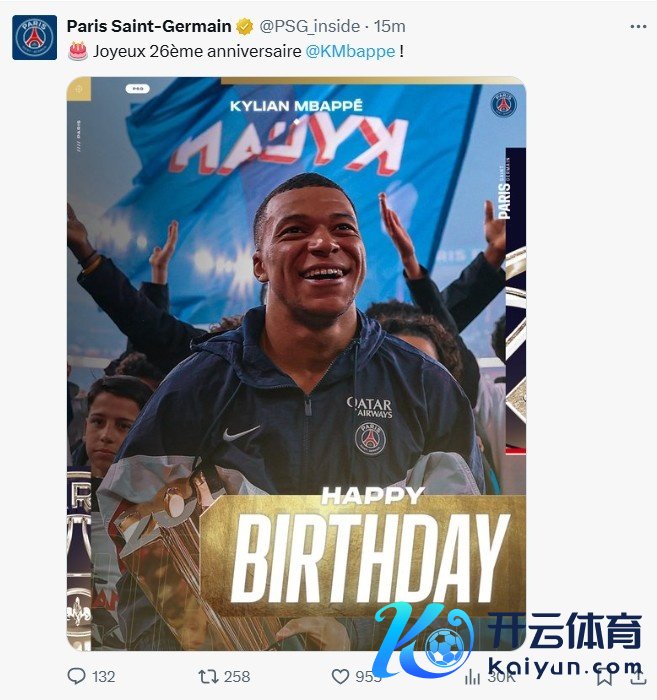 12月20日讯 今天姆巴佩迎来26岁生辰,巴黎圣日耳曼官方更新动态,向他示意了祝颂。